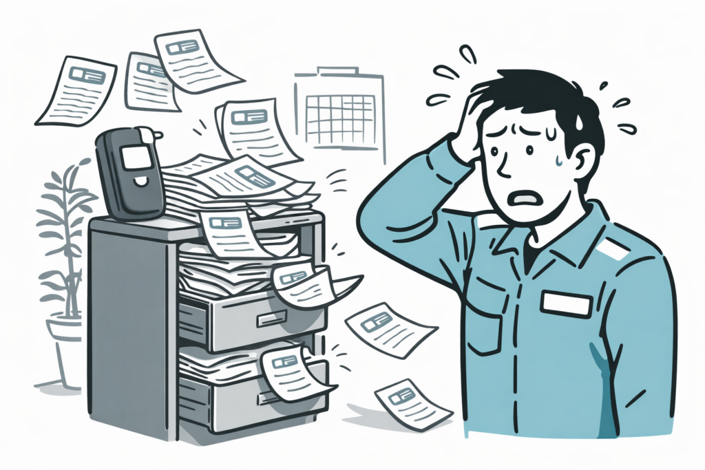 2023年12月の義務化以降、多くの企業でアルコールチェックが日常業務となりました。しかし、測定すること自体に意識が向きがちで、その後の「記録の保存・管理」がおろそかになっているケースが見受けられます。
